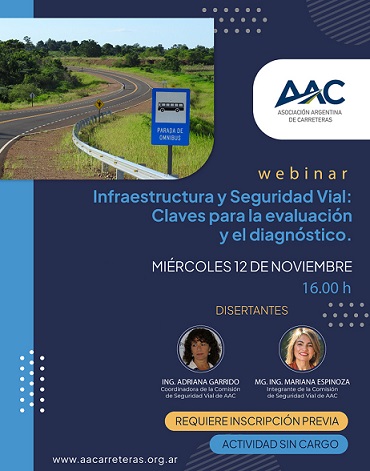 Los invitamos a este nuevo webinar organizado por la Comisión de Seguridad Vial de la Asociación Argentina de Carreteras donde se abordará, desde una mirada técnica y basada en evidencia, la evaluación de la seguridad vial en tramos específicos de la Red nacional y el análisis de la siniestralidad en otros corredores que presentan puntos críticos.